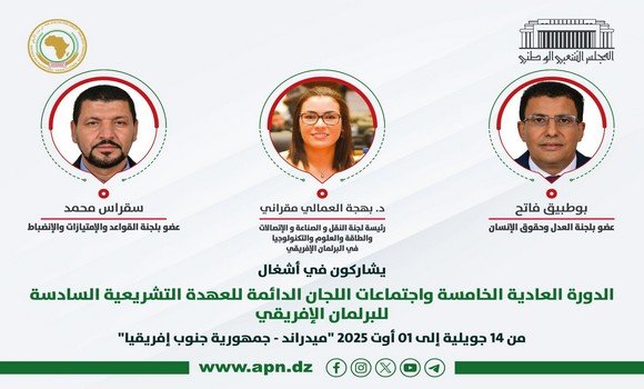 وأوضح نفس المصدر أن “وفد المجلس الذي يشارك في أشغال الدورة التي ستمتد إلى 1 أغسطس المقبل, يضم كل من رئيسة لجنة النقل والاتصالات والطاقة والعلم والتكنولوجيا بالبرلمان الإفريقي, السيدة بهجة العمالي, رئيس المجموعة البرلمانية لجبهة المستقبل, عضو لجنة العدل وحقوق الإنسان, السيد فاتح بوطبيق, و عضو لجنة القواعد والامتيازات والانضباط, السيد سقراس محمد”.