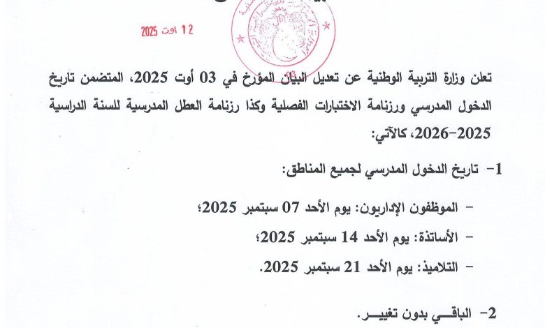 وجاء في البيان: “تعلن وزارة التربية الوطنية عن تعديل البيان المؤرخ في 3 أغسطس 2025 والمتضمن تاريخ الدخول المدرسي ورزنامة الاختبارات الفصلية وكذا رزنامة العطل المدرسية للسنة الدراسية 2025-2026”.