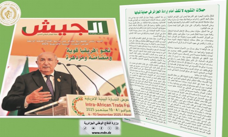 أكدت مجلة “الجيش”, في عددها لشهر سبتمبر, أن حملات التشويه و التضليل التي تمارسها وسائل الإعلام المعادية, لن تقف أمام إرادة الجزائر في حماية شبابها.