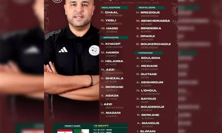 استدعى مدرب المنتخب الوطني المحلي، مجيد بوقرة، 27 لاعبا تحسبا للمواجهة المزدوجة الودية أمام نظيره المصري في شهر نوفمبر الجاري بالقاهرة، وذلك في إطار تحضيراته لكأس العرب “فيفا 2025” المقرر إقامتها في ديسمبر المقبل في قطر، حسب ما أعلنت عنه الاتحادية الجزائرية لكرة القدم اليوم السبت.